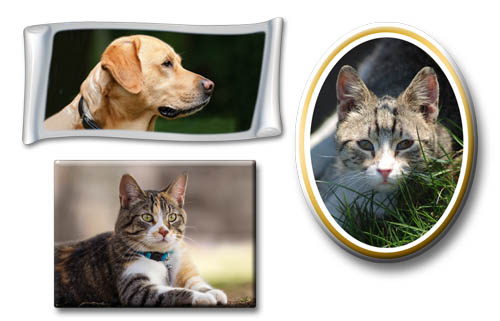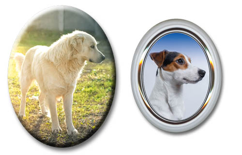 Pet Porcelain Photos text can be done in all the shapes and sizes — oval with raised edge, ellipse, rectangular, round, heart shaped, dome, miniature, parchment shaped, book shaped.
